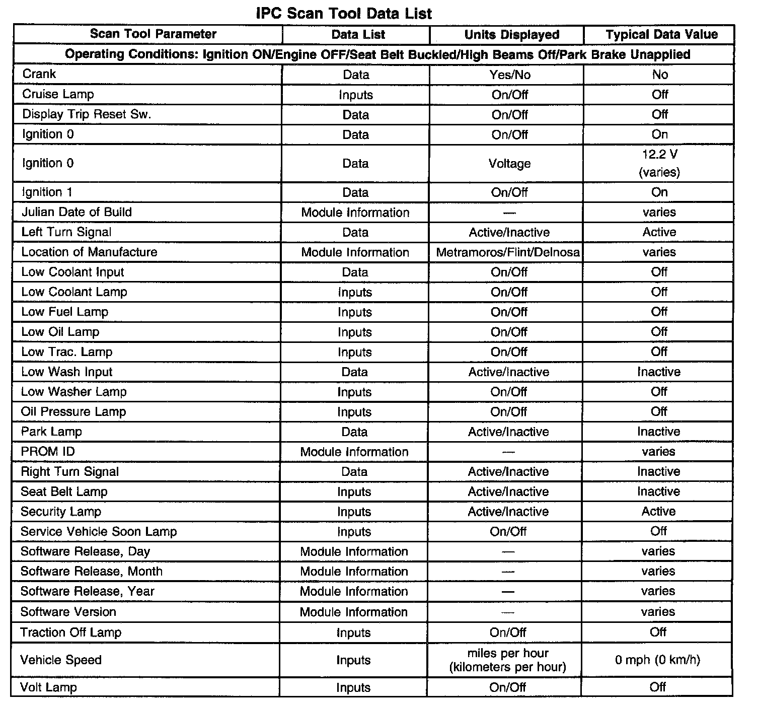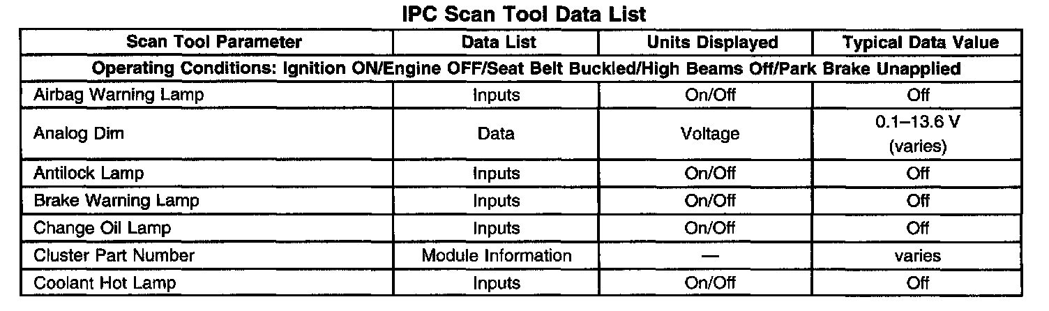 Scan Tool Data List - Instrument Panel Cluster (IPC)