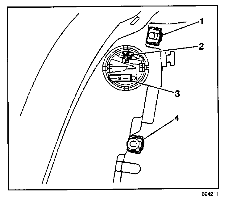 Horizontal and vertical aiming of each of the composite headlamps is done by turning adjusting screws which move the headlamp capsule in relation to the headlamp housing assembly. The horizontal adjustment screw (1) is located on the rear upper edge of each of the headlamp assemblies, toward the outboard side of the vehicle. The vertical adjustment screw (4) is located on the rear upper edge of each of the headlamp assemblies, toward the center of the vehicle.