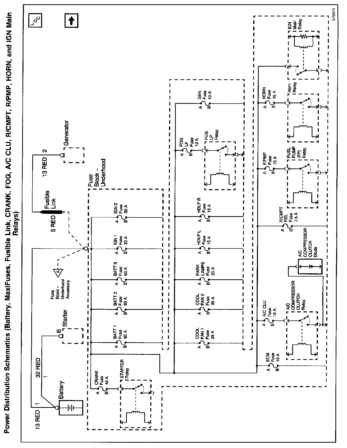 Power Distribution Schematics: Battery, MaxiFuses, Fusible Link, CRANK, FOG, A/C CLU, R/CMPT, R/PMP, HORN, And IGN Main Relays: