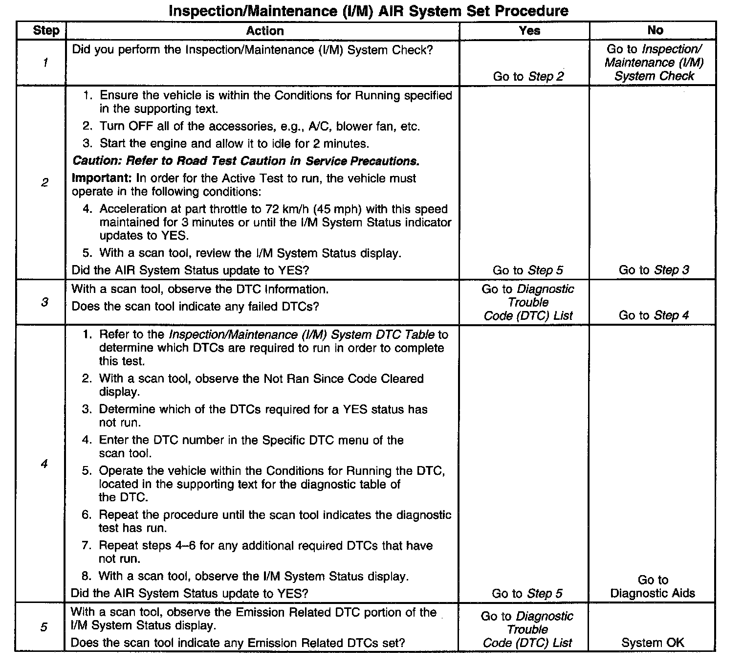 5. The I/M System Status only reports on whether or not a diagnostic has run, not what the outcome of the test was. If any Emission Related DTC sets after the tests are complete, the DTC will require diagnosis.