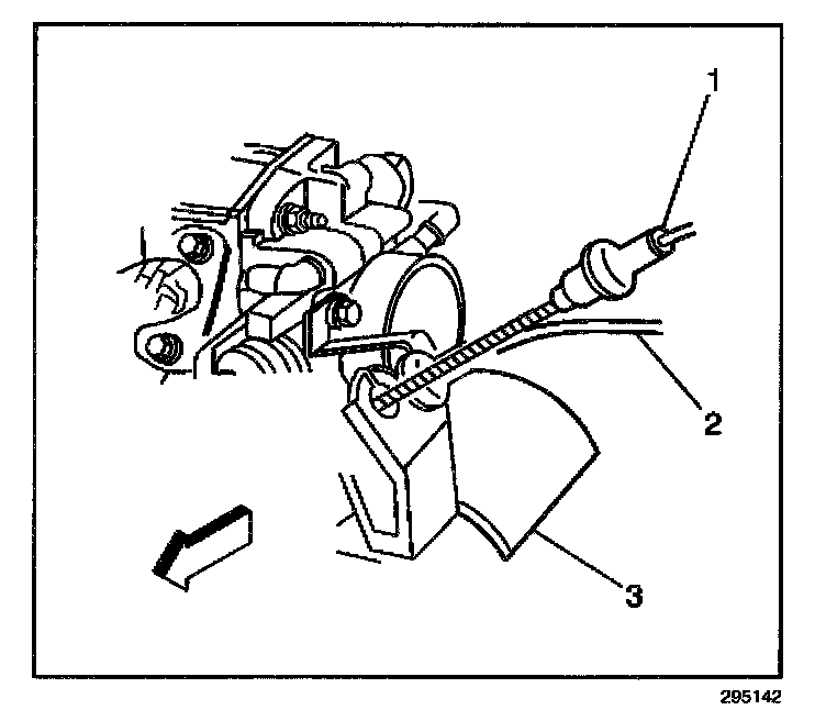 2. Remove the cruise control cable (1) from the bracket (3).