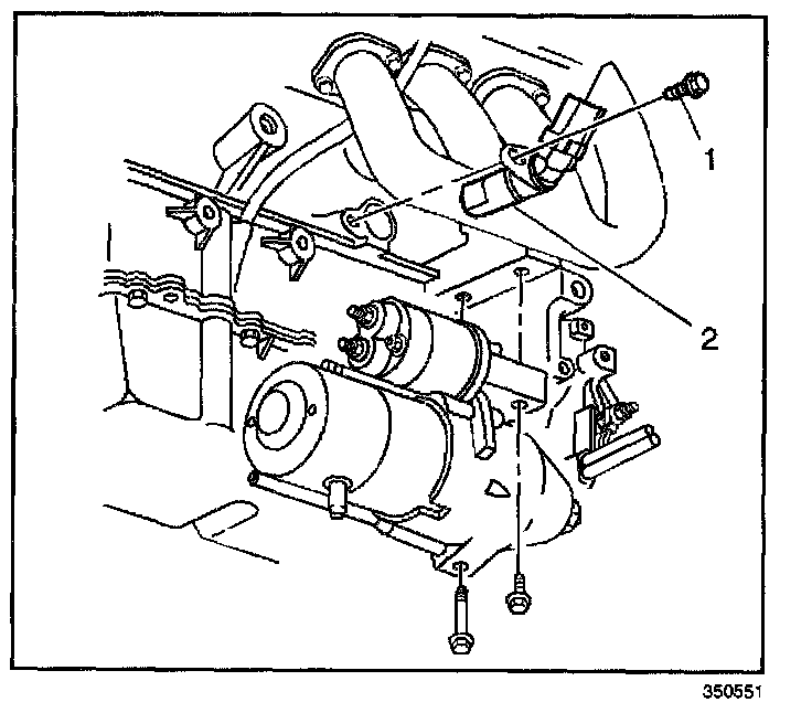 2. Re-install or tighten the starter motor (1) as necessary. Refer to Starter Motor Replacement in Starting and Charging.