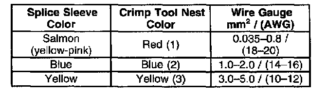 4. Select the proper sealed splice sleeve according to the wire size. Refer to the above table at the beginning of the repair procedure for the color coding of the splice sleeves and the crimp tool nests.