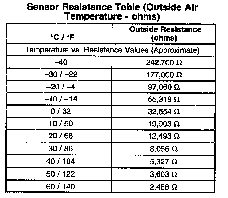 Sensor Resistance Table (Outside Air Temperature - Ohms):