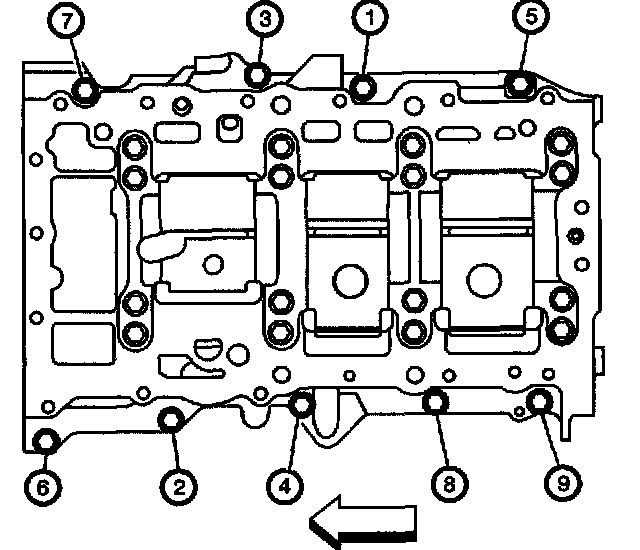 Tighten the lower crankcase perimeter bolts (1 through 9) in proper sequence.