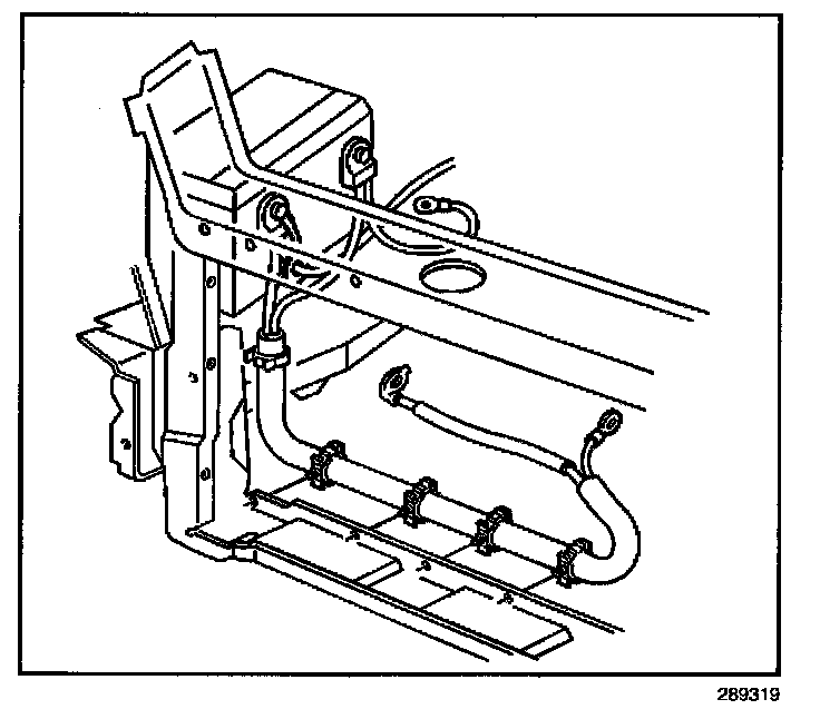 8. Remove the battery cable retainers from the engine frame.