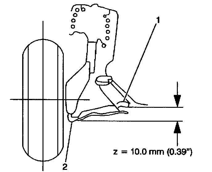 4. The D height (represented as (1) in the figure) is measured from a point 30 mm (1.1 inch) outboard of the rear brake hose bracket bolt centerline to the bolt centerline of the trailing arm to the knuckle attachment.