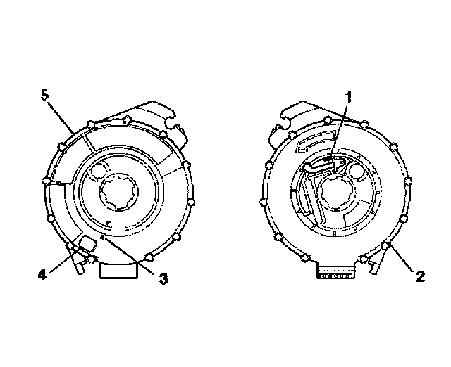 2. If the front (5) of the inflatable restraint steering wheel module coil has a centering window (4), and on the back side (2) a spring service lock (1), perform the following steps: