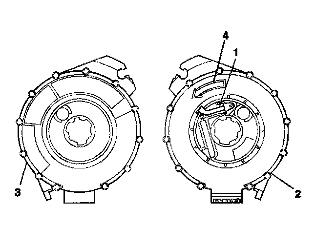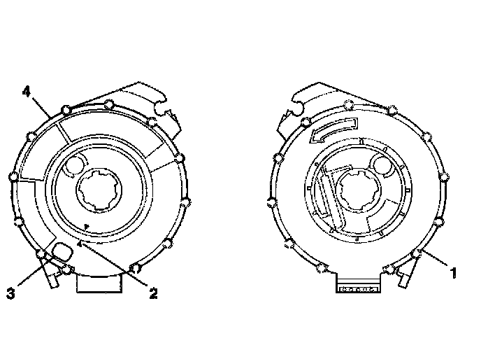 3. If the front (4) of the inflatable restraint steering wheel module coil has a centering window (3) and no spring service lock on the back side (1), perform the following steps: