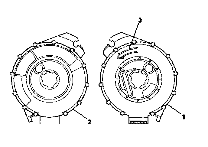 5. For no centering window on the front side (2) of the inflatable restraint steering wheel module coil and no spring service lock on the back side (1), perform the following steps: