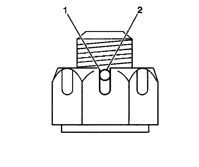 5. If necessary, tighten the ball stud castle nut in order to align the ball stud castle nut slot (1) to the ball stud cotter pin hole (2) as shown.