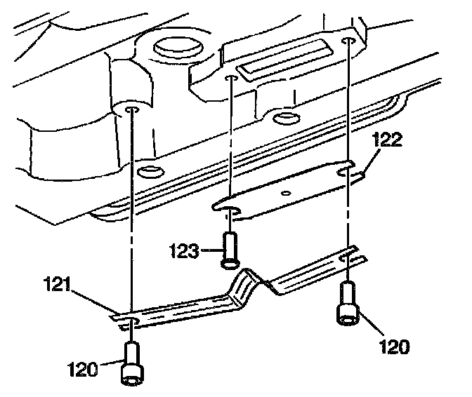 6. Carefully install the thermo element (121) between the two pin and washers (120). The V in the thermo element (121) must contact the thermo element plate (122).