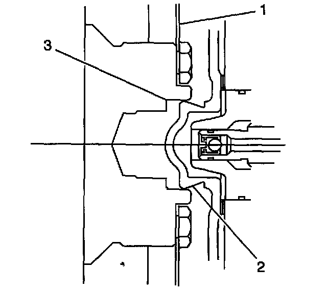 3. Align the torque converter hub (2) in the engine crankshaft (3) and install the torque converter to flywheel bolts.
