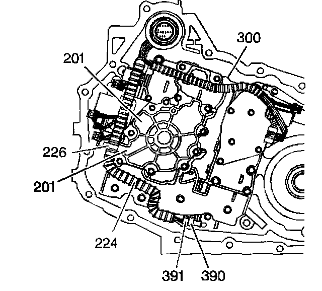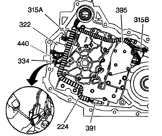 2. Use a small flat-bladed tool in order to remove the wiring harness from the solenoid valve(s) (315A, 315B, 322, 334 and/or 440), TFP manual valve position switch (395) and/or the temperature sensor (391)