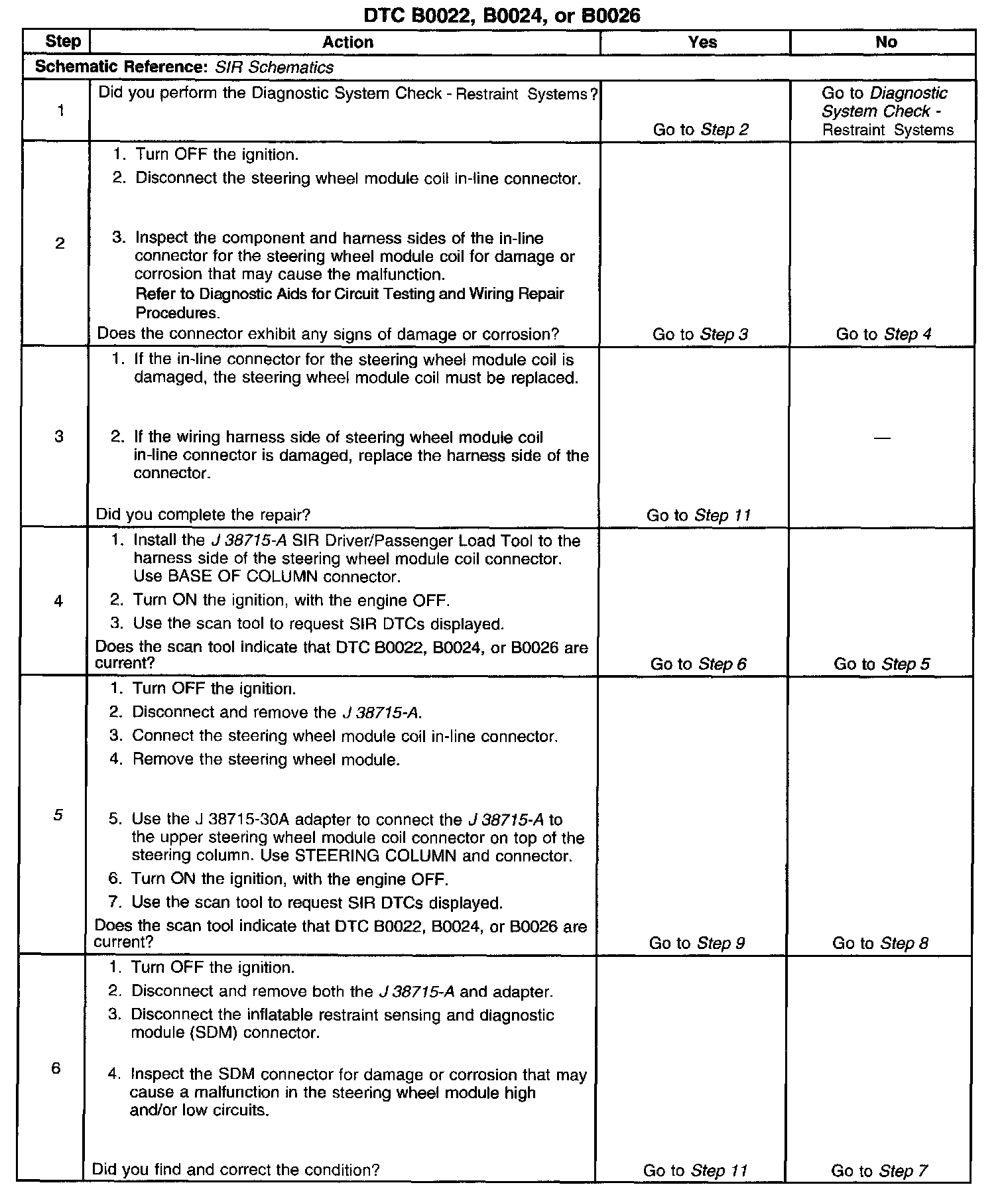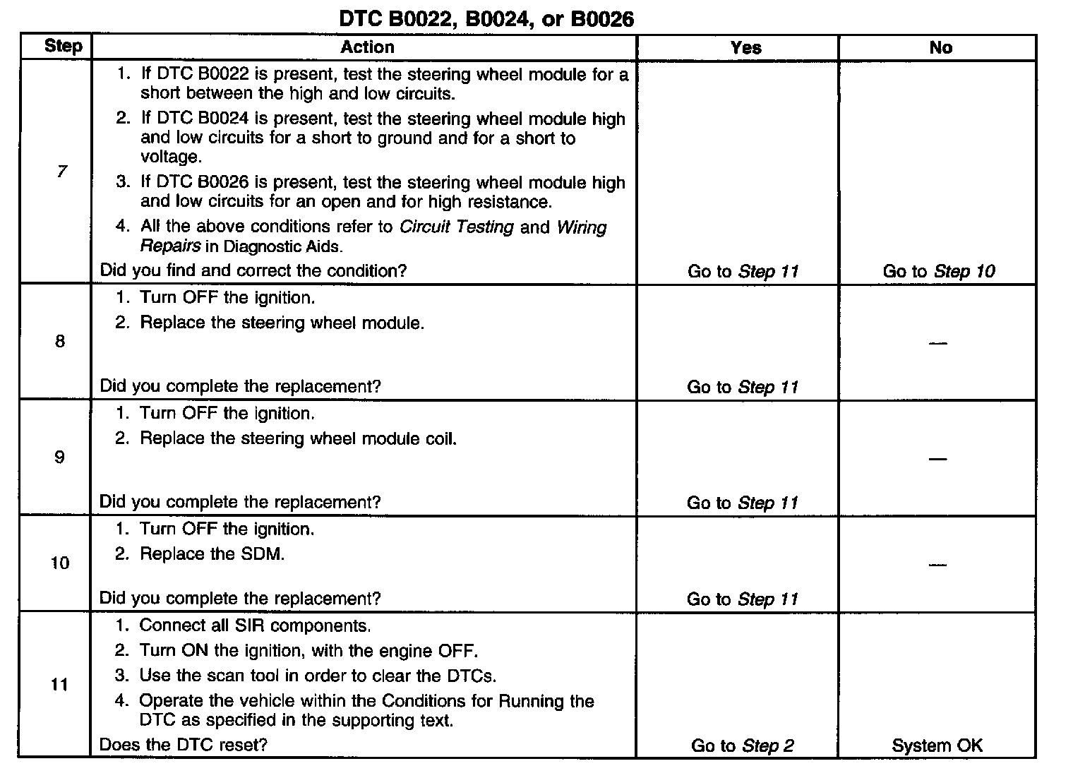 7. This step tests to see what DTCs are present. If DTC B0022 is present, test the steering wheel module for a short between high and low circuits. If DTC B0024 is present, test the steering wheel module high and low circuits for an open and for high resistance. If DTC B0026 is present, test the steering wheel module high and low circuits for an open and for high resistance.