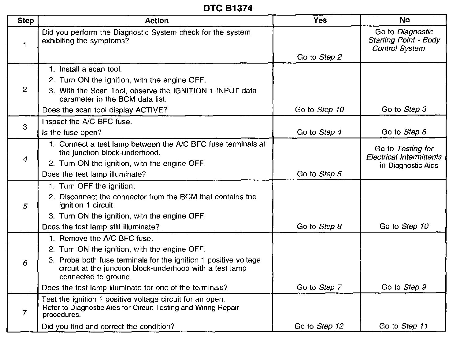 CIRCUIT DESCRIPTIONThe BCM uses a input from the ignition switch to determine the power mode that the vehicle is in, this input is ignition 1. When the BCM senses that ignition 1 is inactive when ignition 0 and 3 are active and the engine is running, DTC B1374 is set.