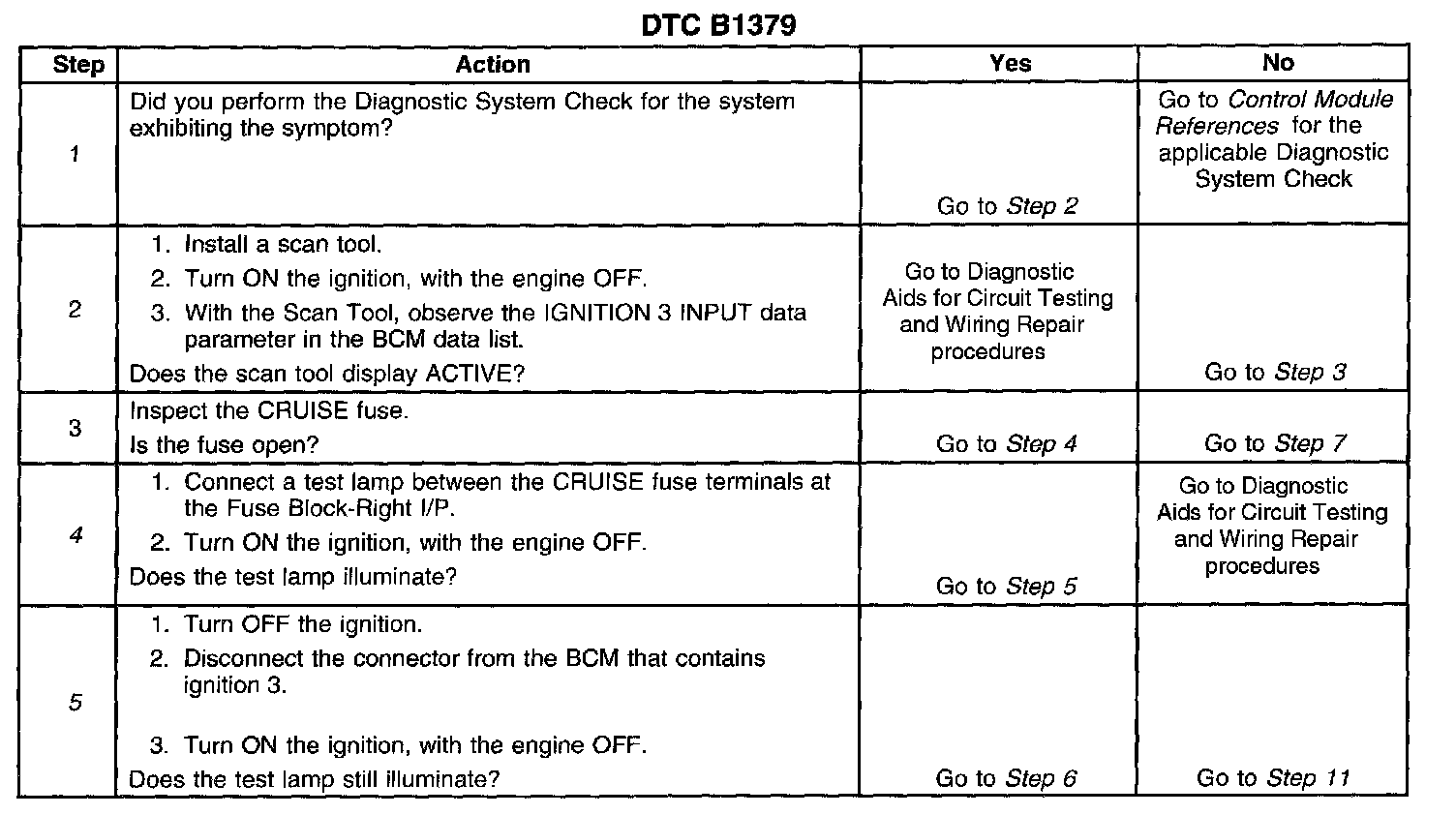 CIRCUIT DESCRIPTIONIgnition 3 input to the body control module BCM from the ignition switch, is used to determine the power mode the vehicle is in. When the BCM senses that the ignition 3 input is inactive when ignition 1 is active and the engine is running, DTC B1379 sets.