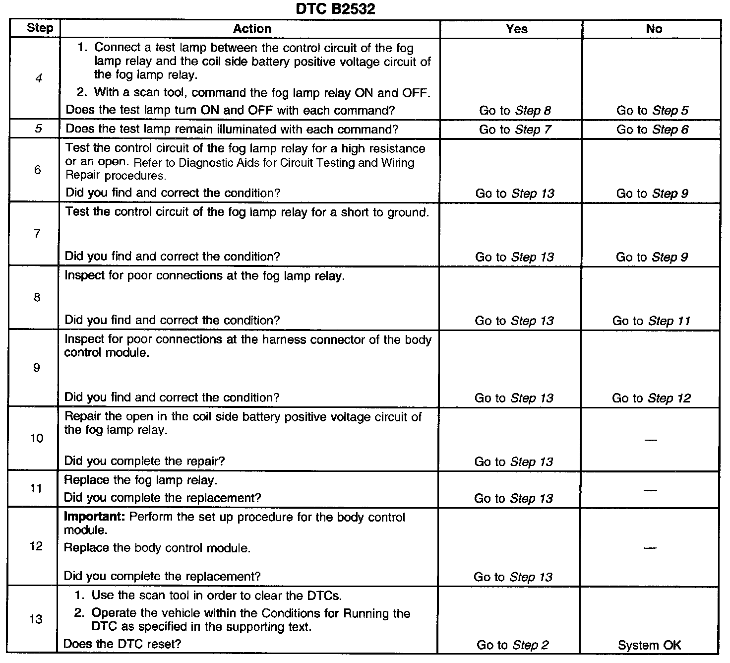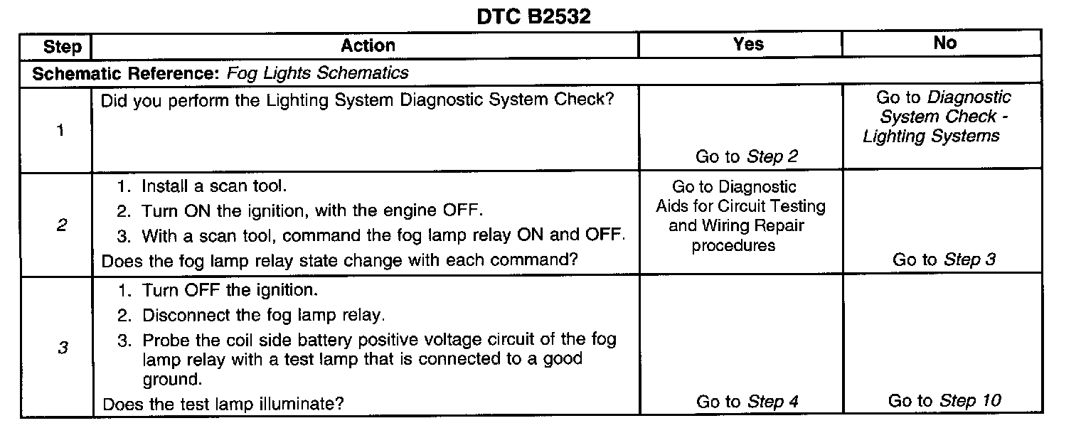 CIRCUIT DESCRIPTIONThe fog lamp relay is controlled by the Body Control Module (BCM). Battery positive voltage is applied to the coil side of the fog lamp relay. The BCM provides ground to the fog lamp relay control circuit in order to turn on the fog lamp relay. When the fog lamp relay control circuit becomes open or shorted to ground without being commanded on by the BCM, DTC B2532 is set.