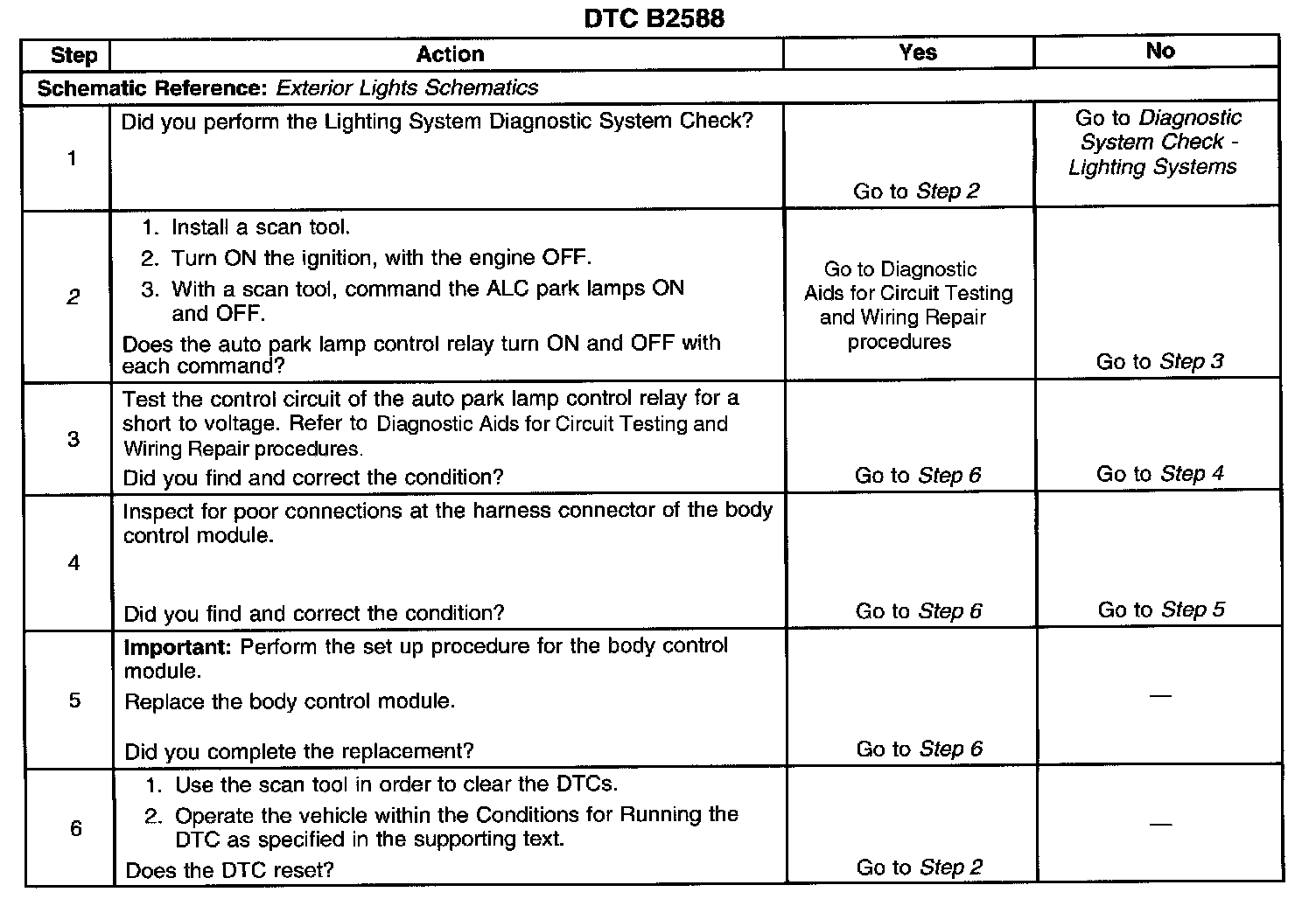 2. Listen for an audible click when the auto park lamp control relay operates. Command both the ON and OFF states. Repeat the commands as necessary.