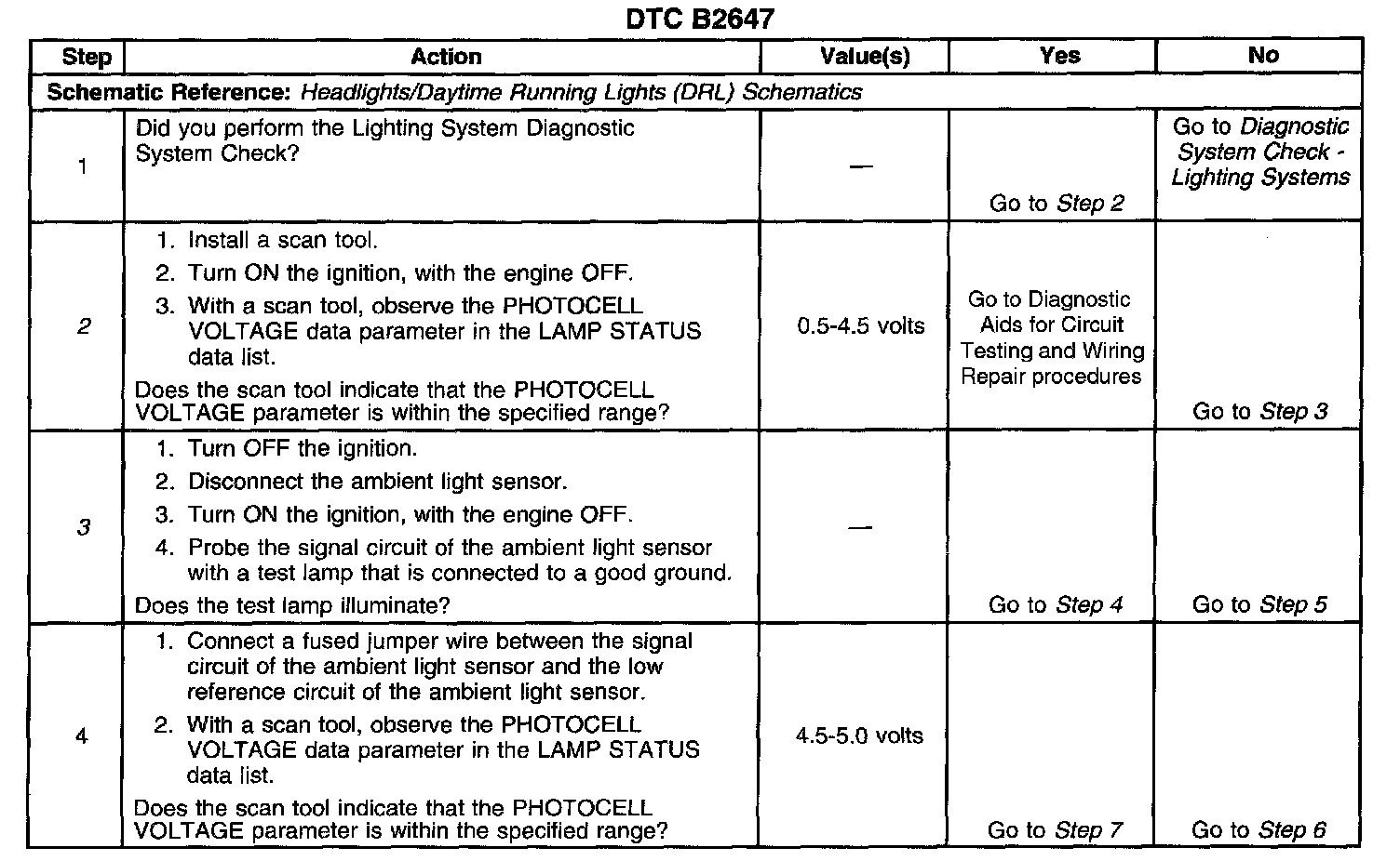 CIRCUIT DESCRIPTIONThe ambient light sensor indicates the light level to control the automatic headlamps and park lamps. The Body Control Module (BCM) provides a 5 volt reference signal to the light sensor through the ambient light sensor signal circuit. The BCM receives the modified voltage from the ambient light sensor through the ambient light sensor low reference circuit. A low voltage under 1.5 V, signals a dark condition to the BCM and vice versa.