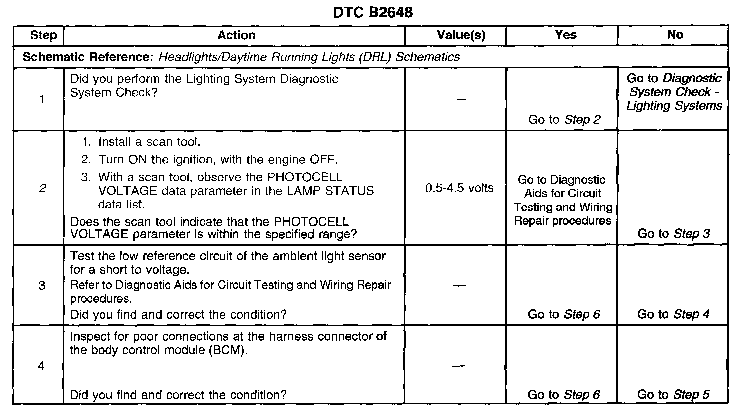 CIRCUIT DESCRIPTIONThe ambient light sensor indicates the light level to control the automatic headlamps and park lamps. The Body Control Module (BCM) provides a 5 volt reference signal to the ambient light sensor through the ambient light sensor signal circuit. The BCM receives the modified voltage from the ambient light sensor through the ambient light sensor low reference circuit. A low voltage under 1.5 V, signals a dark condition to the BCM and vice versa.