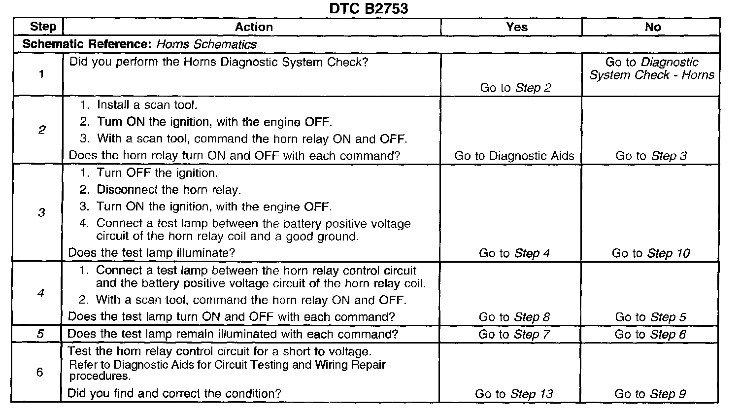 2. Listen for an audible click when the horn relay operates. Command both the ON and OFF states. Repeat the commands as necessary.