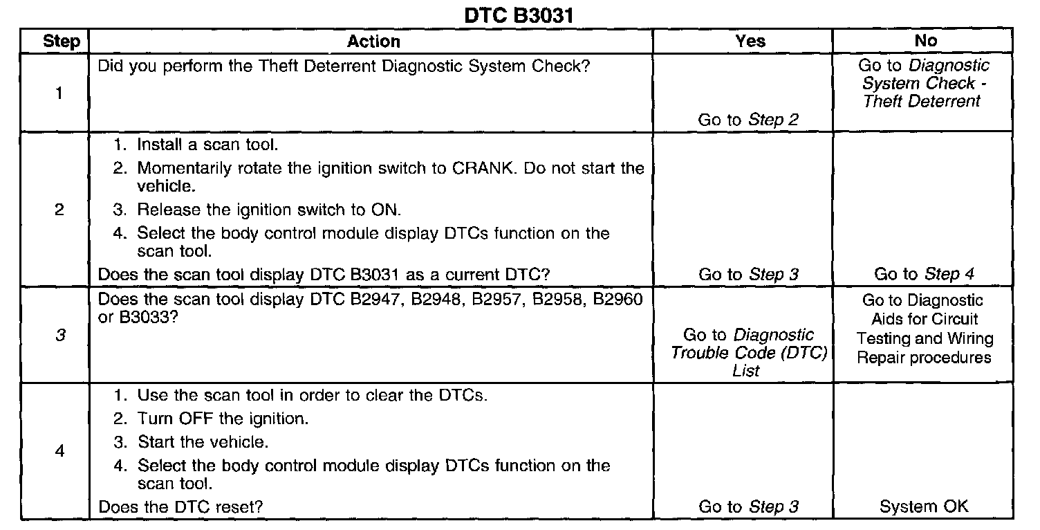 ^ If DTC B3031 is set in the BCM as a history DTC, clear the DTC and recheck the system. A history DTC B3031 indicates that the BCM has successfully completed the programming mode.