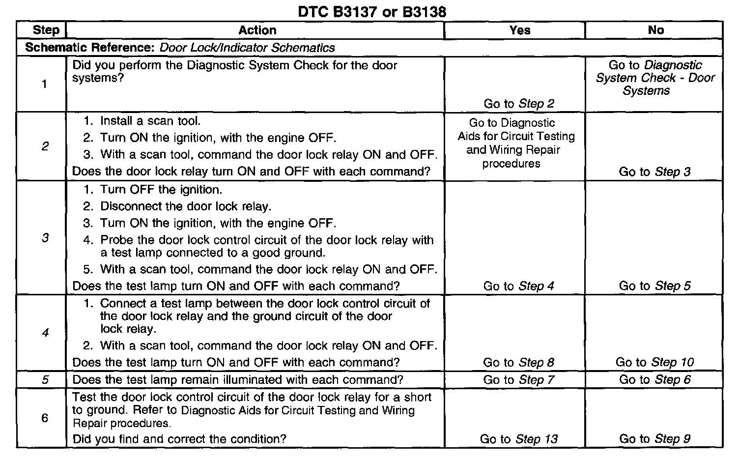 The door lock control circuit is shorted to ground for 0.2 seconds, for DTC B3137. The door lock control circuit is shorted to battery positive voltage for 0.2 seconds, for DTC B3138.