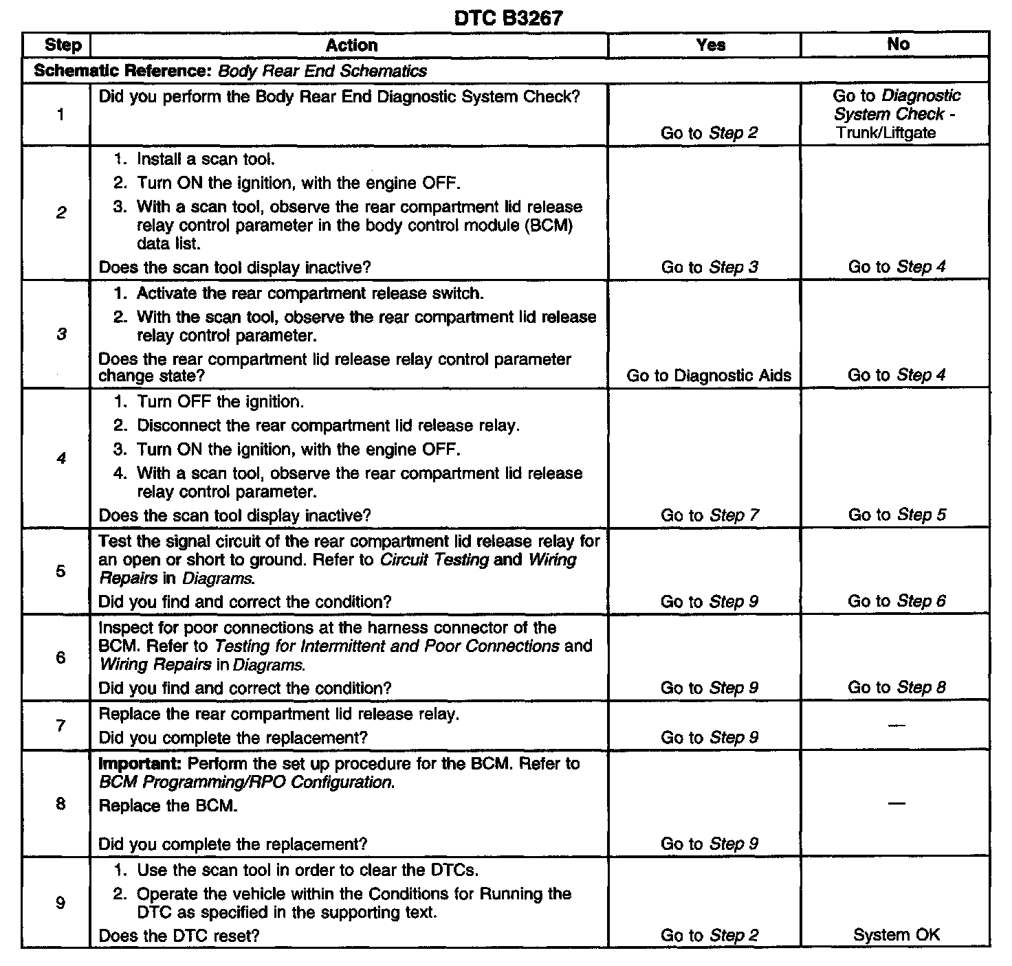 ^ A short to ground is no longer detected in the rear compartment lid release relay control circuit. A history DTC B3267 will clear after 100 consecutive ignition cycles if the condition for the malfunction is no longer present.