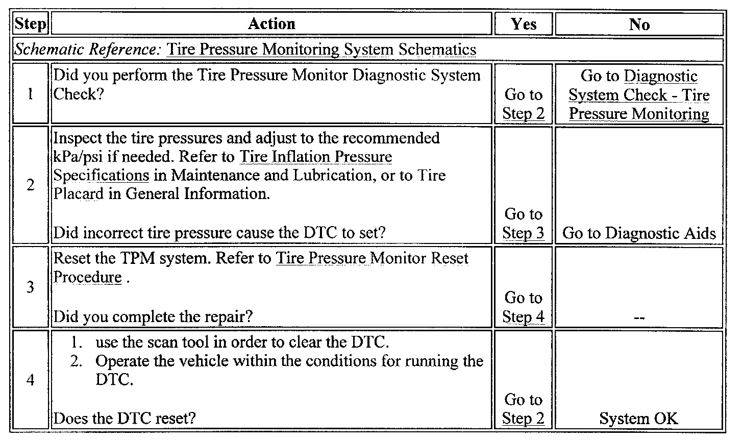 - The EBCM detects a tire pressure difference in one tire of 69 kPa (10 psi) higher or lower than the other three.