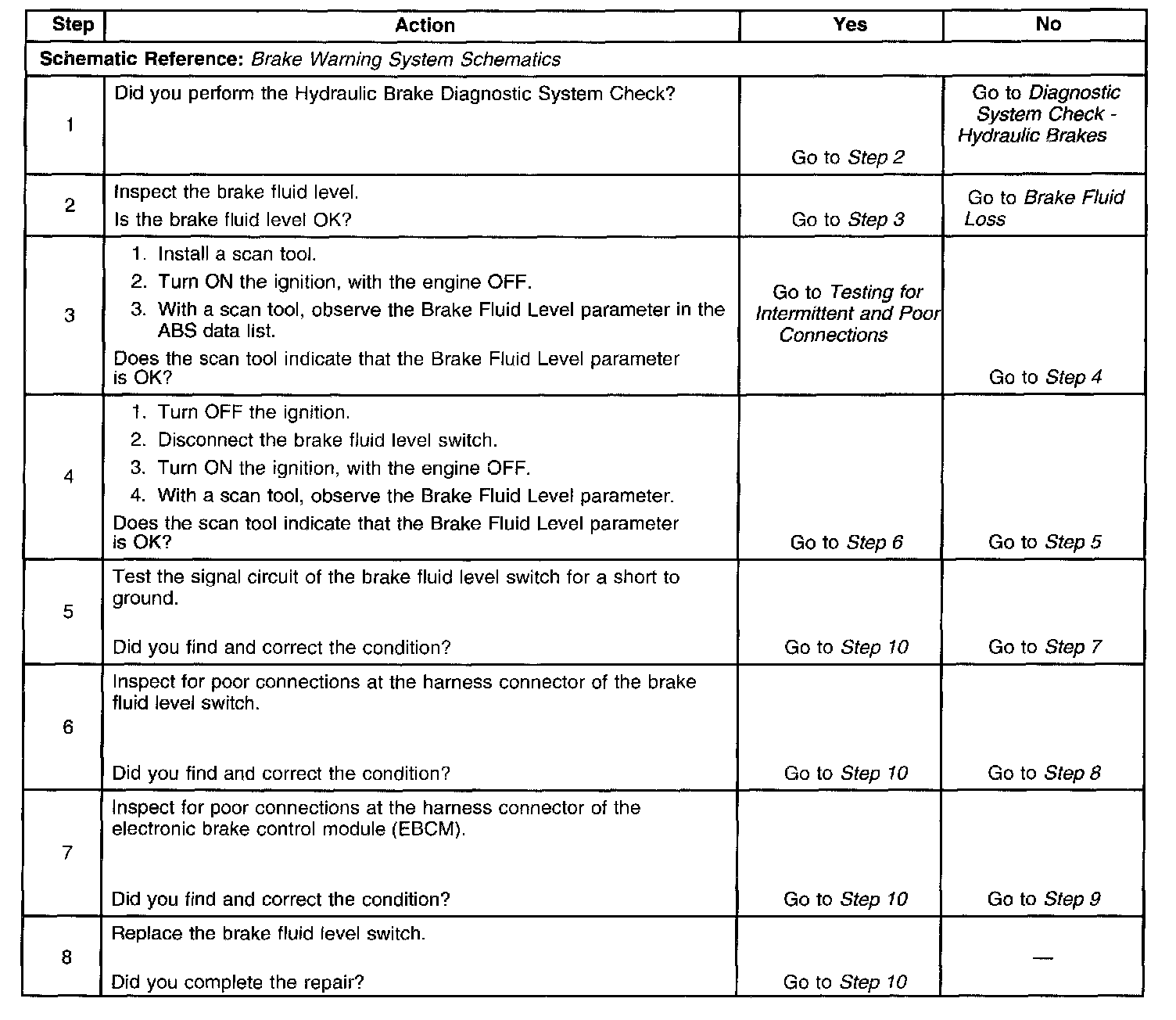 The brake fluid level switch monitors the level of brake fluid in the master cylinder. When the EBCM sees the brake fluid level switch input grounded, it sends a serial data message to the IPC that tells the IPC that the brake fluid level is low. The IPC then turns ON the red Brake indicator.