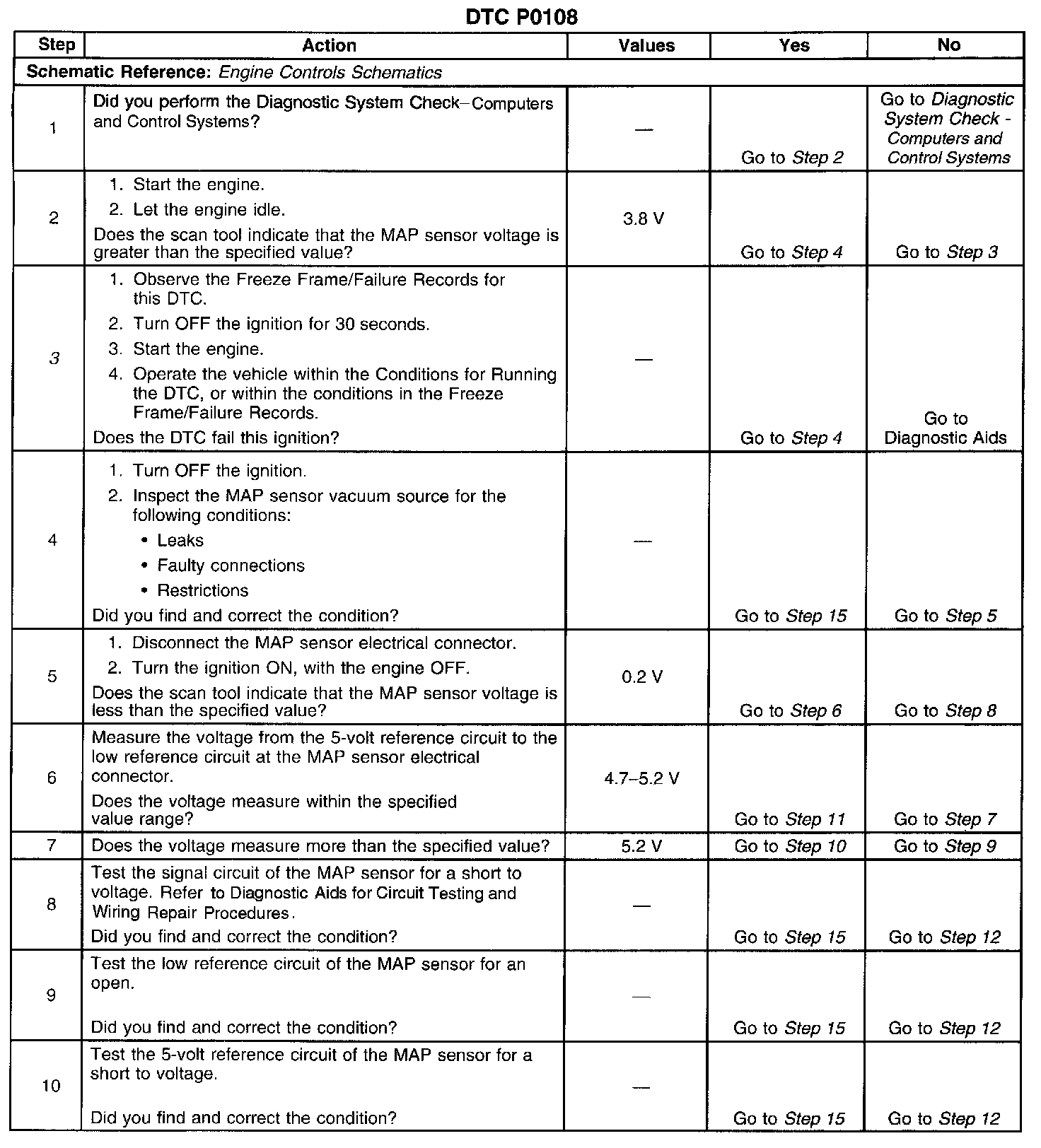 If the PCM detects a MAP sensor signal voltage that is excessively high, DTC P0108 will set.