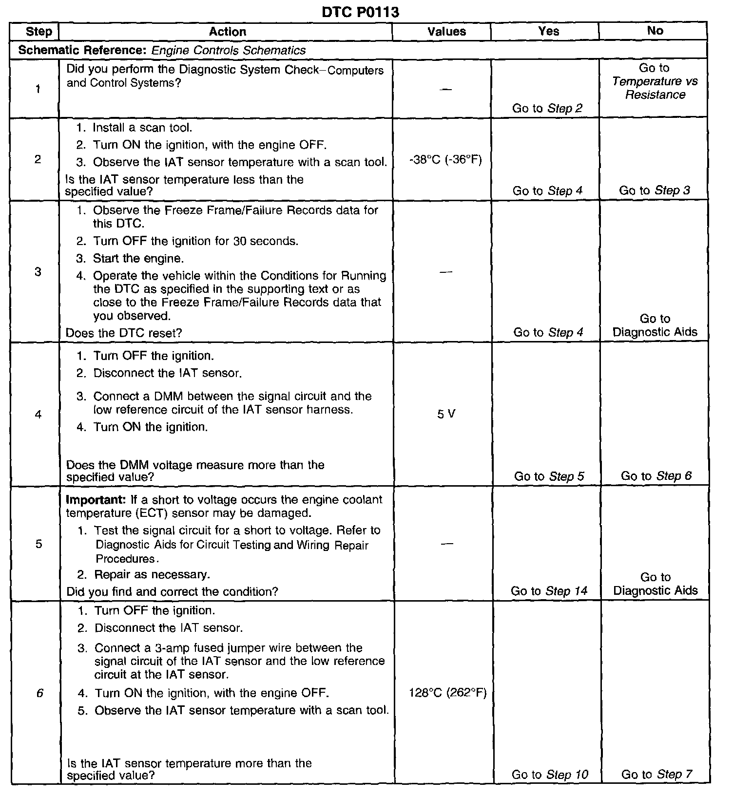 CIRCUIT DESCRIPTIONThe intake air temperature (IAT) sensor is a variable resistor, sometimes called a thermistor. The IAT sensor measures the temperature of the air entering the engine. The powertrain control module (PCM) supplies 5 volts to the IAT signal circuit. When the IAT sensor is cold, the sensor resistance is high. When the air temperature increases, the sensor resistance lowers. With high sensor resistance, the PCM detects a high voltage on the IAT signal circuit. With lower sensor resistance, the PCM detects a lower voltage on the IAT signal circuit. If the PCM detects an excessively high IAT signal voltage, indicating a low temperature, this diagnostic trouble code (DTC) will set.