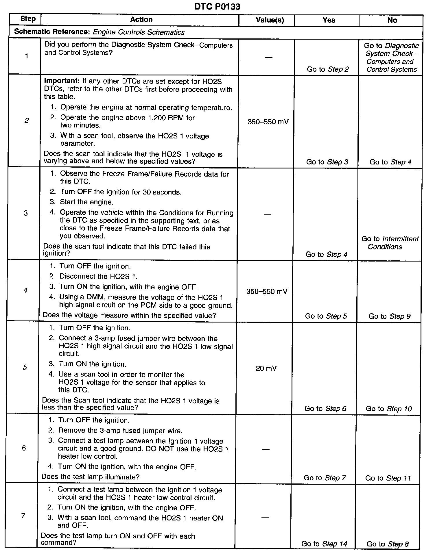 2. When the system is operating correctly, the HO2S 1 voltage should toggle above and below the specified values. You may need to operate the vehicle within the Freeze Frame conditions and Conditions for Setting the DTC in order to duplicate the malfunction that was detected by the PCM.