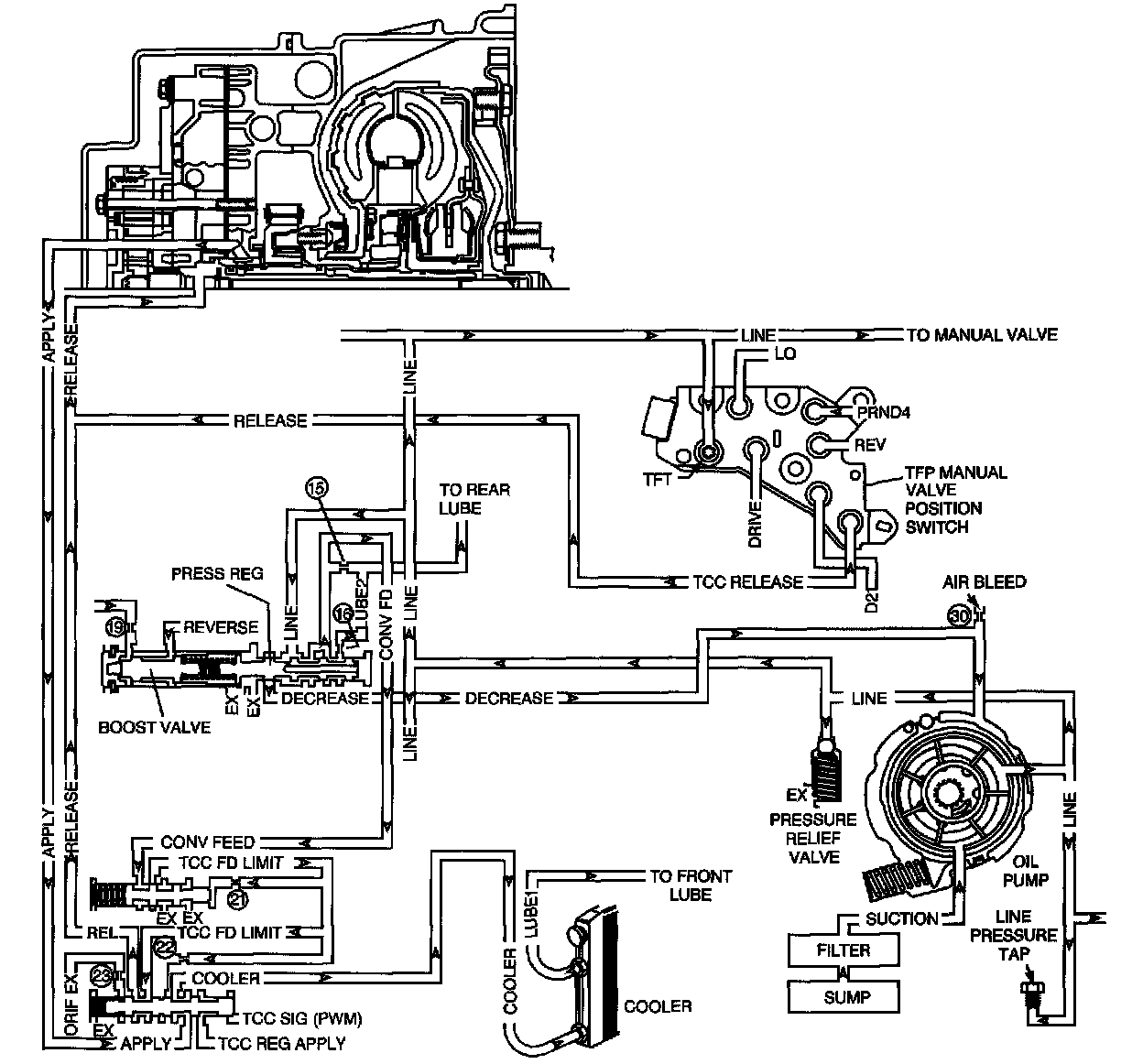 The transmission fluid pump is constantly circulating fluid through the torque converter. Hot fluid leaving the converter flows through the transmission cooler lines to the oil cooler, located in the vehicle radiator. From the cooler, the fluid returns to the transmission.