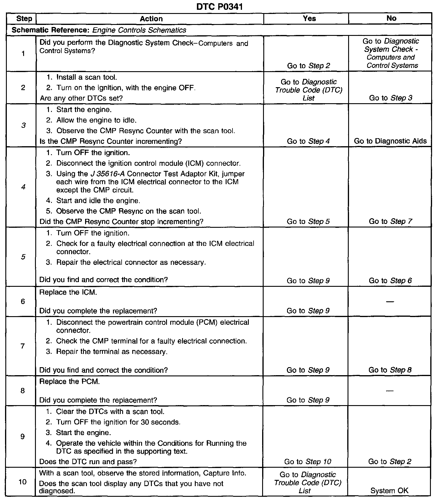 ^ Electromagnetic interference (EMI) may also set DTC P0341. Inspect the wiring harness for damage. If the harness appears to be OK, observe the CMP resync counter on the scan tool while moving connectors and wiring harnesses related to the CMP sensor. If the CMP resync counter still does not count, while observing the scan tool, operate any non-engine related electrical components on the vehicle. A change in display will indicate the location of the malfunction.