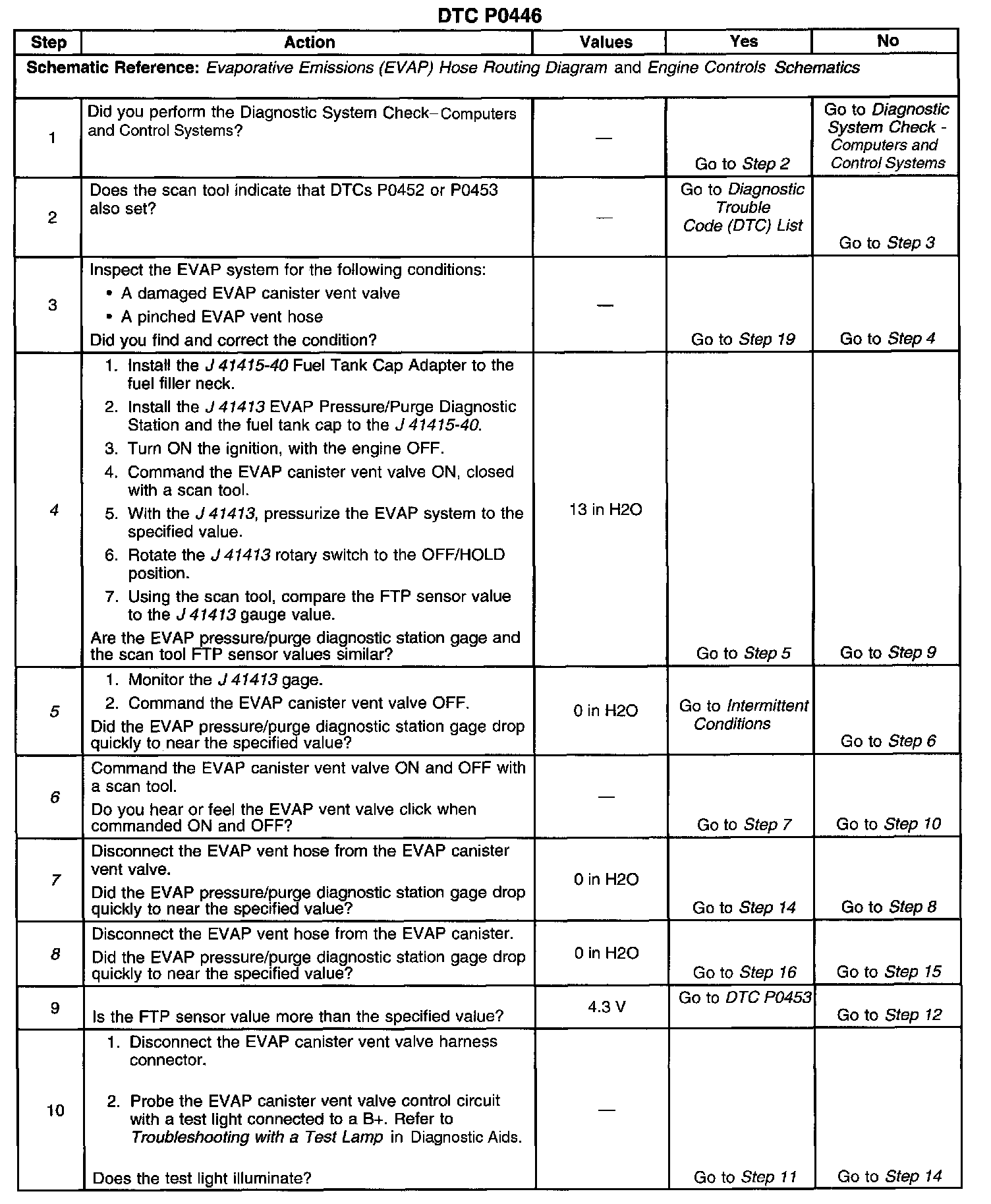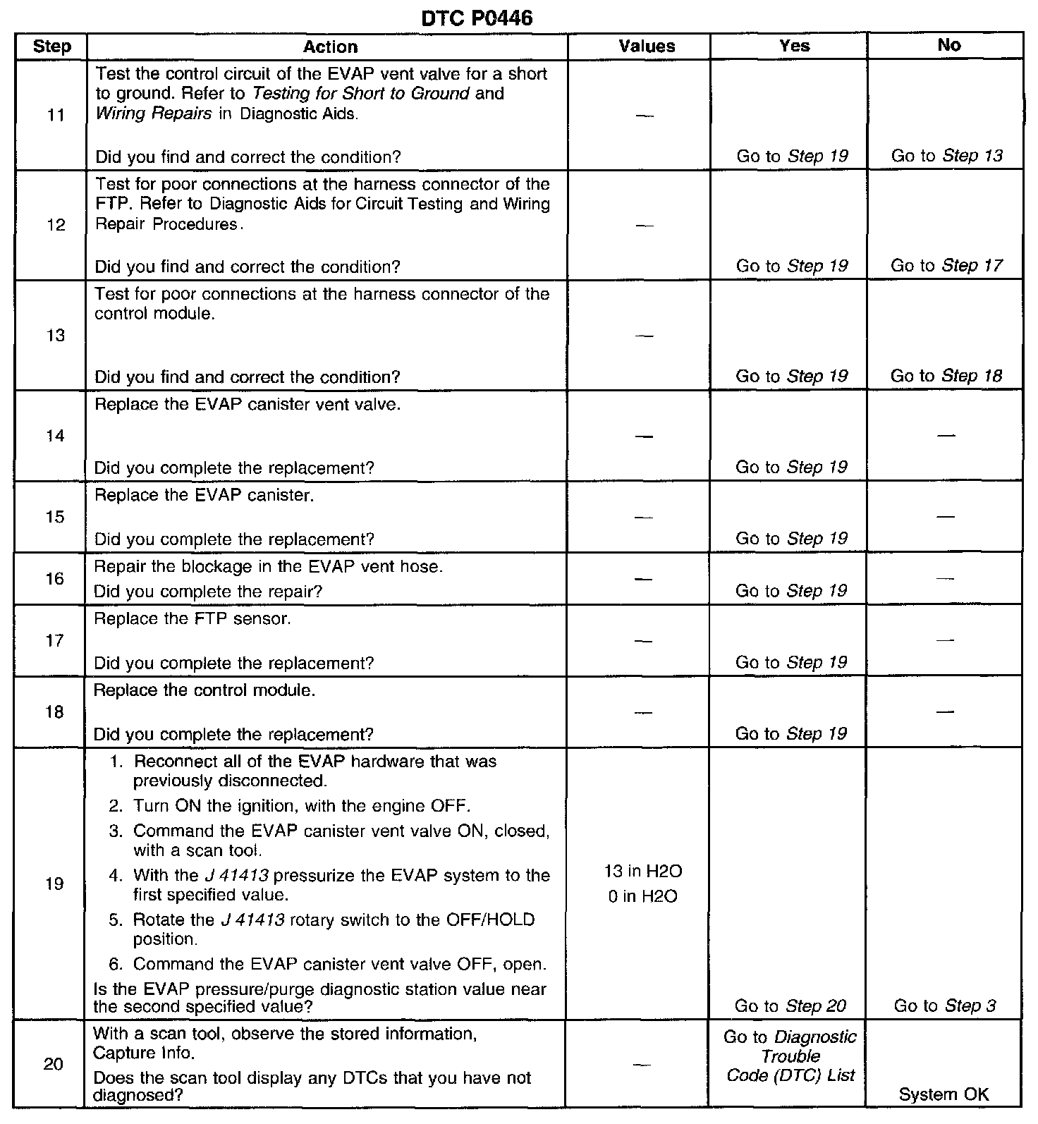 CIRCUIT DESCRIPTIONA restricted or blocked evaporative emission (EVAP) vent path is detected by the control module commanding the purge valve ON, open, and the vent valve ON, closed, allowing a vacuum to be applied to the EVAP system. Once a calibrated vacuum level has been reached, the control module commands the purge valve OFF, closed, and the vent valve OFF, open, while monitoring the fuel tank pressure (FTP) sensor for a decrease in vacuum. If the vacuum does not decrease to near 0 inches H2O in a calibrated time, DTC P0446 will set.