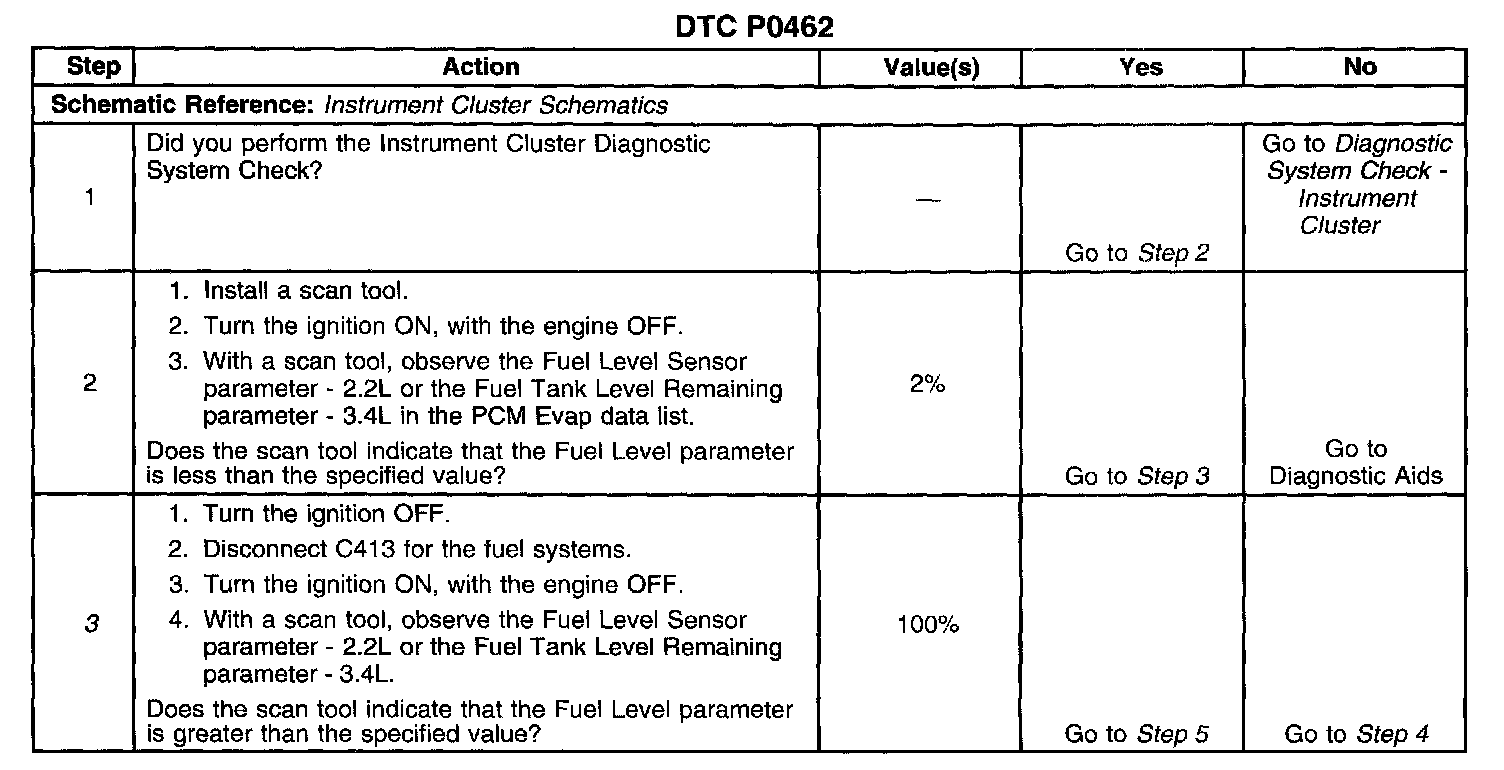 CIRCUIT DESCRIPTIONThe fuel level sensor changes resistance based on fuel level. The PCM monitors the signal circuit of the fuel level sensor in order to determine the fuel level. When the fuel tank is full, the sensor resistance is high and the PCM senses a high signal voltage. When the fuel tank is empty, the sensor resistance is low and the PCM senses a low signal voltage. The PCM uses the signal circuit of the fuel level sensor in order to calculate the total remaining fuel in the tank. The PCM sends the fuel level volume via the class 2 serial data circuit to the instrument cluster in order to control the fuel gage. The fuel level information is also used for misfire and EVAP diagnostics.