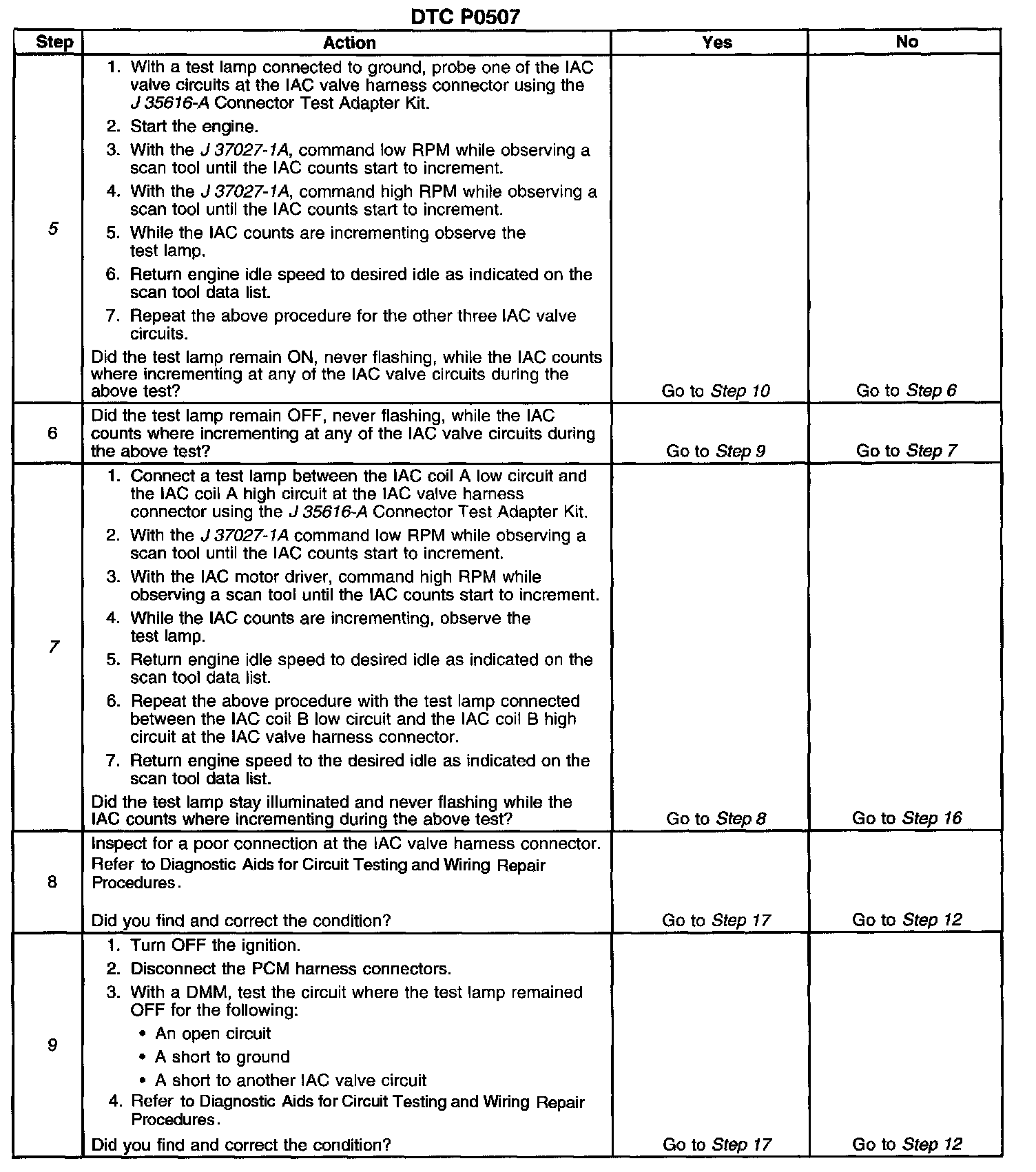 7. This test will determine the ability of the PCM to provide the IAC valve circuits with a ground. On a normally operating system, the test lamp should not flash while the IAC counts are incrementing.