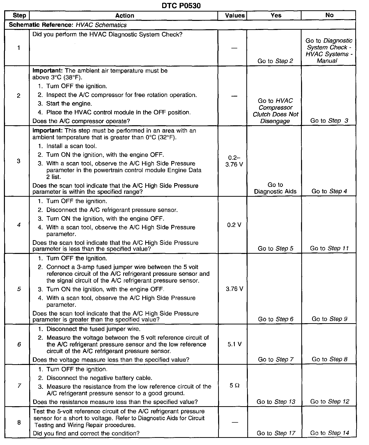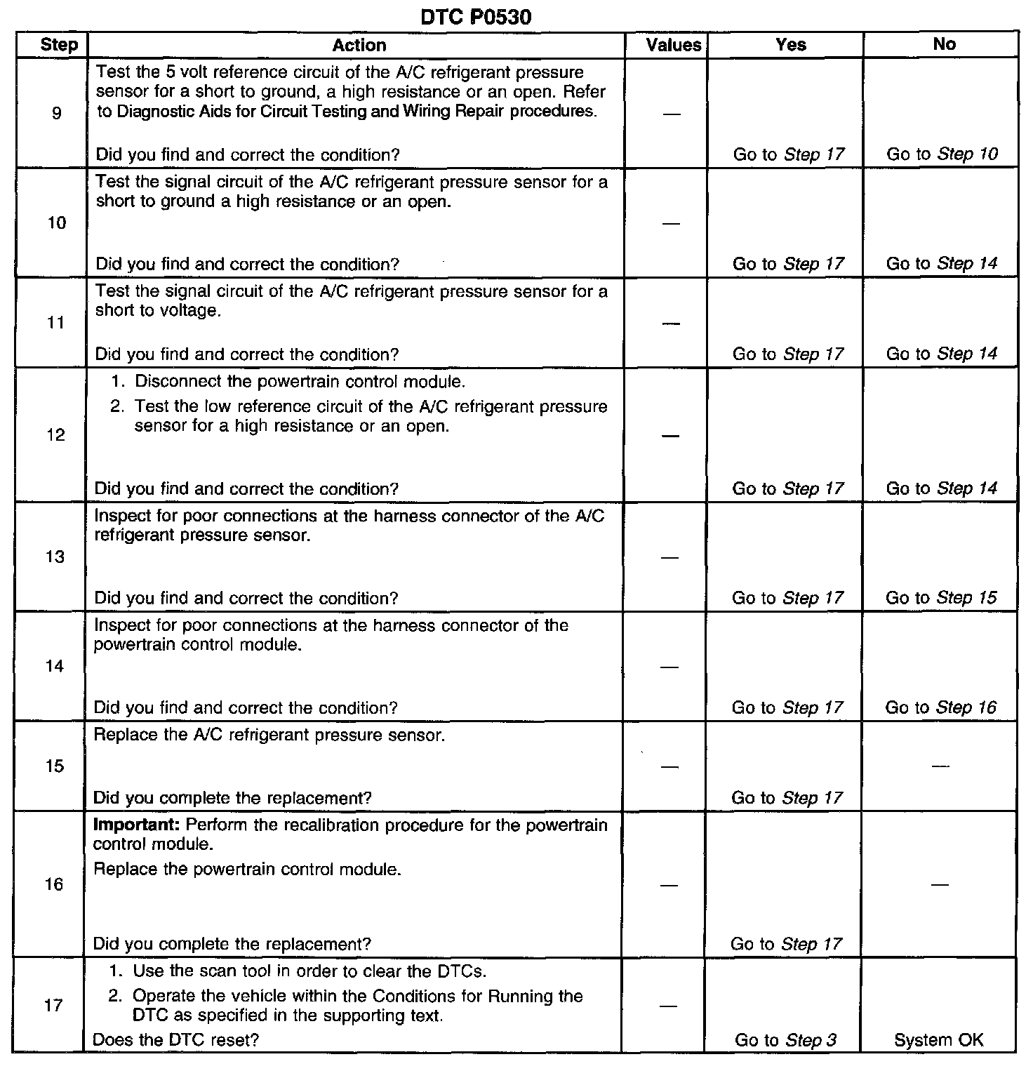 ^ The PCM detects the A/C refrigerant pressure signal circuit is less than 5 counts (0.09 volt) or more than 250 counts (4.90 volt).
