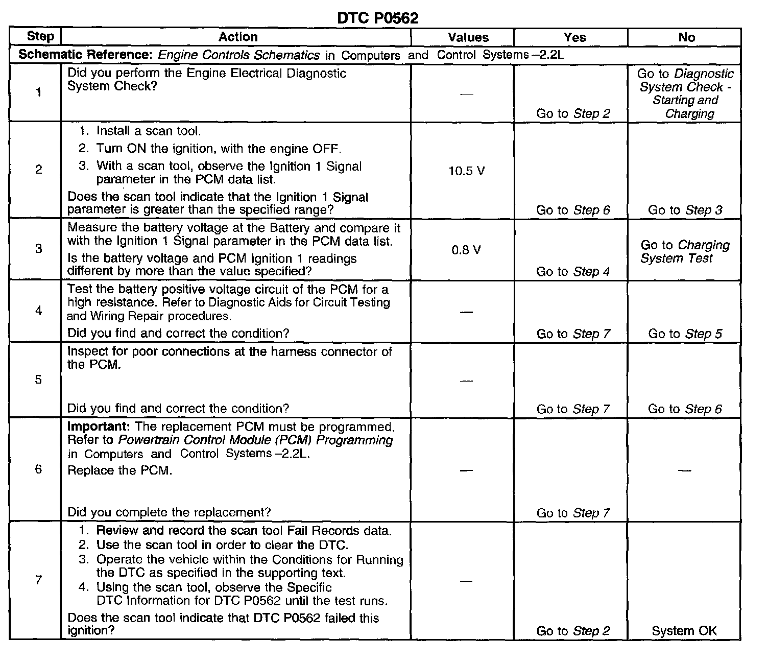 CIRCUIT DESCRIPTIONThe PCM checks the system voltage to make sure that the voltage stays within the proper range. Damage to components and incorrect input can occur when the voltage is out of range. The PCM monitors the system voltage over an extended length of time. If the PCM detects an excessively low system voltage DTC P0562 will set.