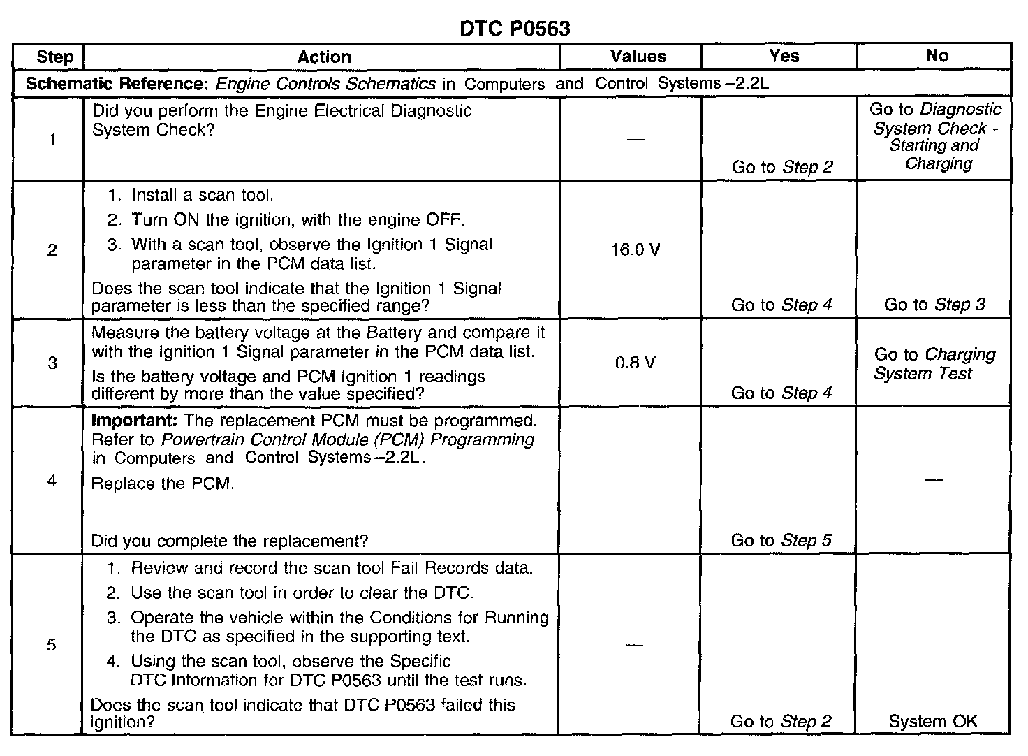 CIRCUIT DESCRIPTIONThe PCM checks the system voltage to make sure that the voltage stays within the proper range. Damage to components, and incorrect input can occur when the voltage is out of range. The PCM monitors the system voltage over an extended length of time. If the PCM detects an excessively high system voltage, DTC P0563 will set.