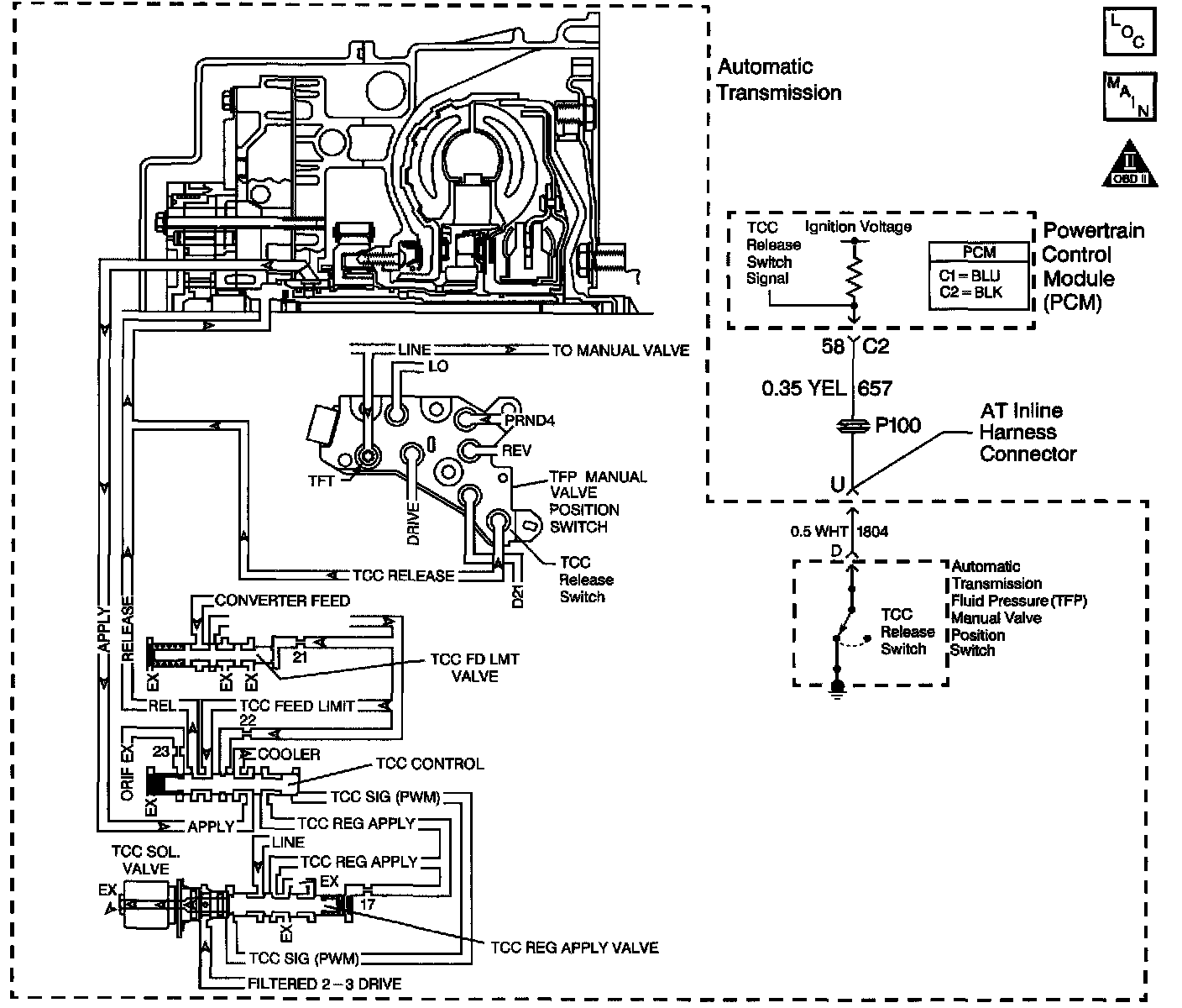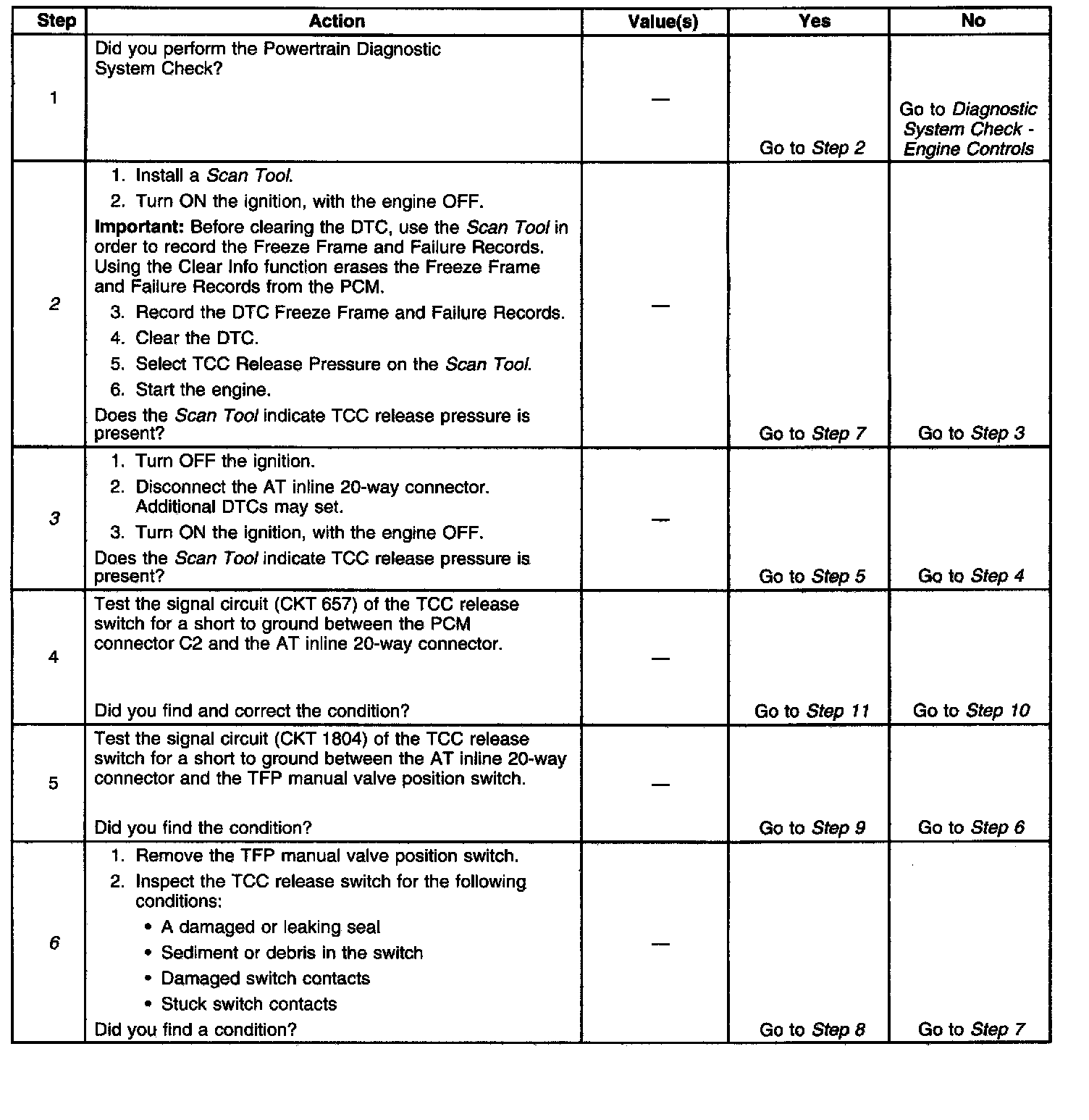 - If the Scan Tool indicated TCC release pressure was present in Step 2 and a mechanical or hydraulic condition was not found in Step 7, an intermittent short to ground condition may exist in the TCC release switch signal circuit.