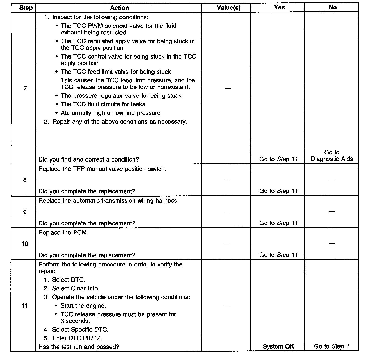 When the PCM detects that the TCC release switch is closed when the TCC is commanded OFF, then DTC P0742 sets. DTC P0742 is a type A DTC.