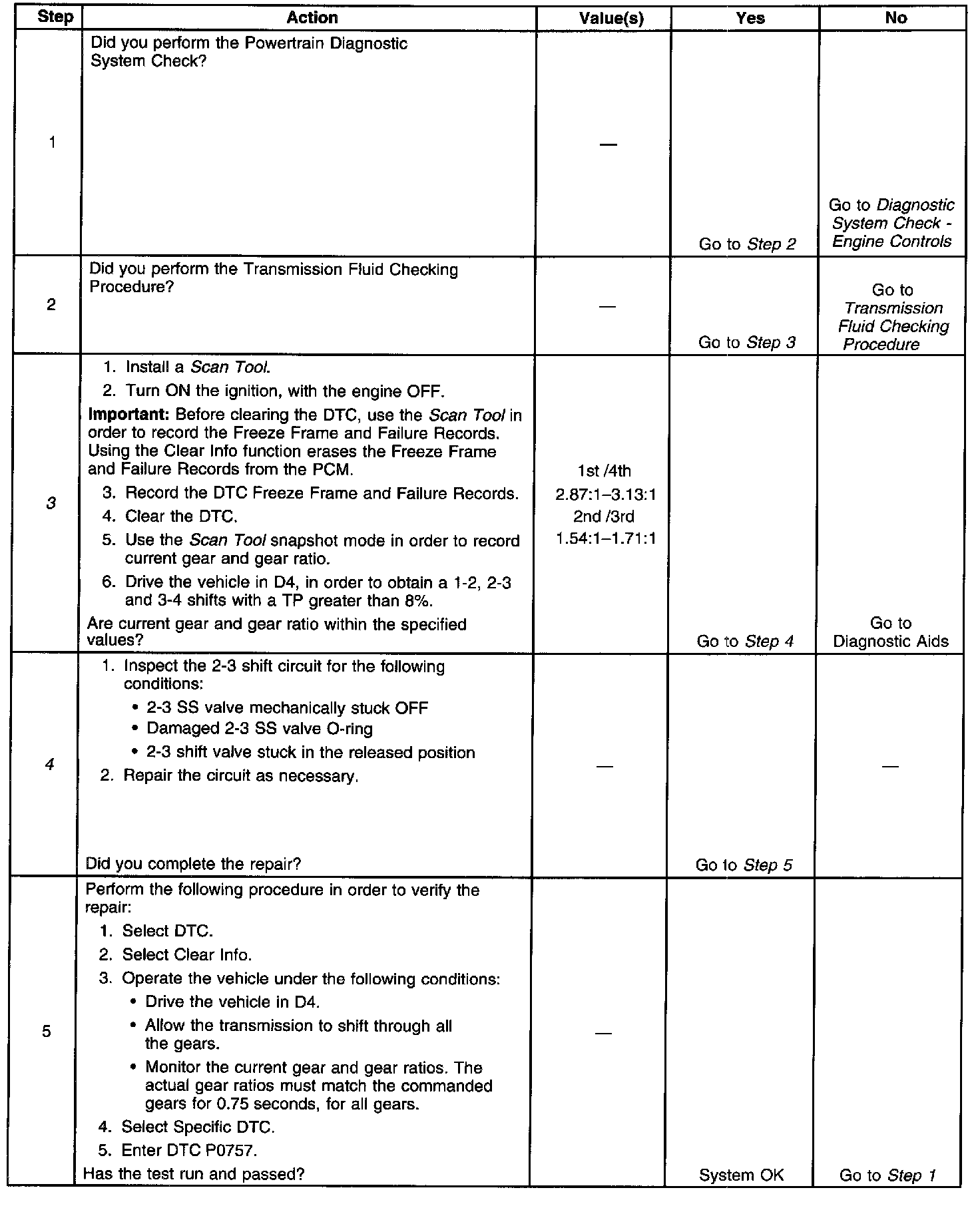 The PCM monitors the actual gear ratio, and compares the actual gear ratio with the commanded gear ratio. DTC P0757 sets under two conditions: