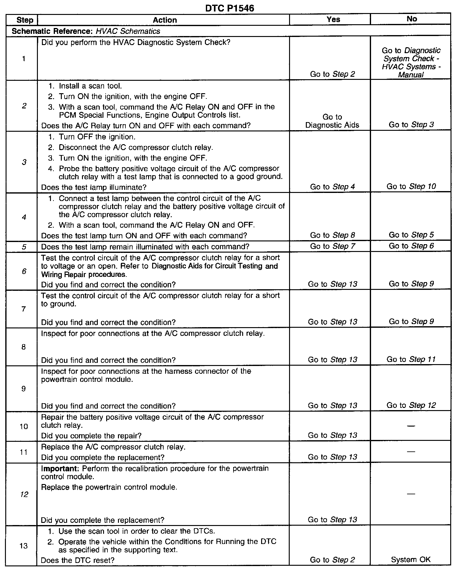 CIRCUIT DESCRIPTIONIgnition voltage is supplied directly to the A/C compressor clutch relay. The powertrain control module (PCM) controls the relay by grounding the control circuit via an internal solid state device called a driver. The primary function of the driver is to supply the ground for the component being controlled. Each driver has a fault line which is monitored by the PCM. When the PCM is commanding a component ON, the voltage of the control circuit should be near 0 volts. When the PCM is commanding the control circuit to a component OFF, the voltage potential of the circuit should be near battery voltage. If the fault detection circuit senses a voltage other than what is expected, this DTC will set.