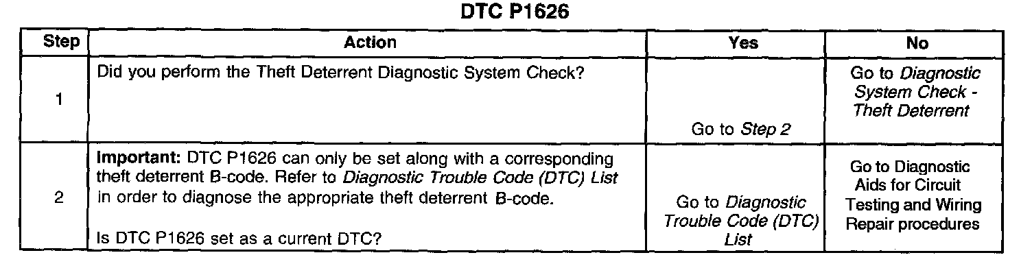CIRCUIT DESCRIPTIONThe Body Control Module (BCM) produces the theft deterrent fuel enable signal when ignition is ON and the proper ignition code voltage value is detected. The Powertrain Control Module (PCM) monitors the fuel enable signal during crank. If the proper signal is present on the Class 2 Serial Data Circuit the PCM enables fuel delivery in order to allow the engine to start. If the PCM determines that the fuel enable signal is not present or incorrect while the engine is running, DTC P1626 is set. The engine continues to start and run as long as DTC P1626 is stored.