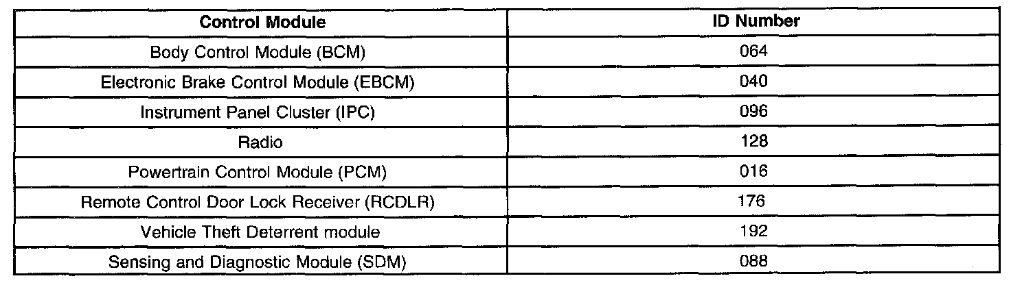 The control module ID number list provides a method for determining which module is not communicating. A module with a class 2 serial data circuit malfunction or which loses power during the current ignition cycle will have a Loss of Communication DTC set by other modules that depend on information from that failed module. The modules that can communicate will set a DTC indicating the module that cannot communicate.
