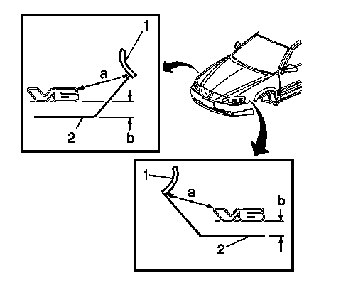 * Dimension (b) is 21 mm (0.827 in) from the bottom of the emblem/nameplate to the fender (2).