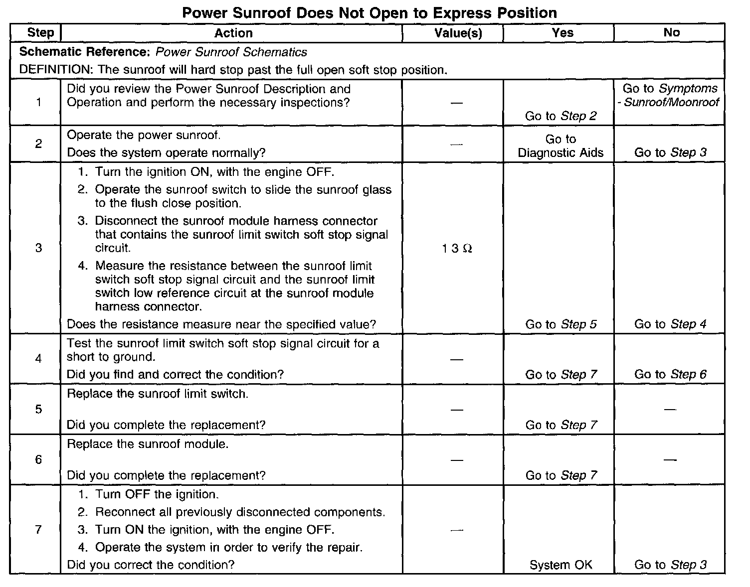 DIAGNOSTIC AIDSThe sunroof limit switch soft stop signal circuit can cause the sunroof glass to hard stop past the soft stop open position, if it were a short to ground or a faulty limit switch. Refer to Diagnostic Aids for Circuit Testing and Wiring Repair procedures. If the circuits test OK, an intermittent or poor connection can also cause the sunroof not to operate normally. Refer to Diagnostic Aids for Circuit Testing and Wiring Repair procedures.